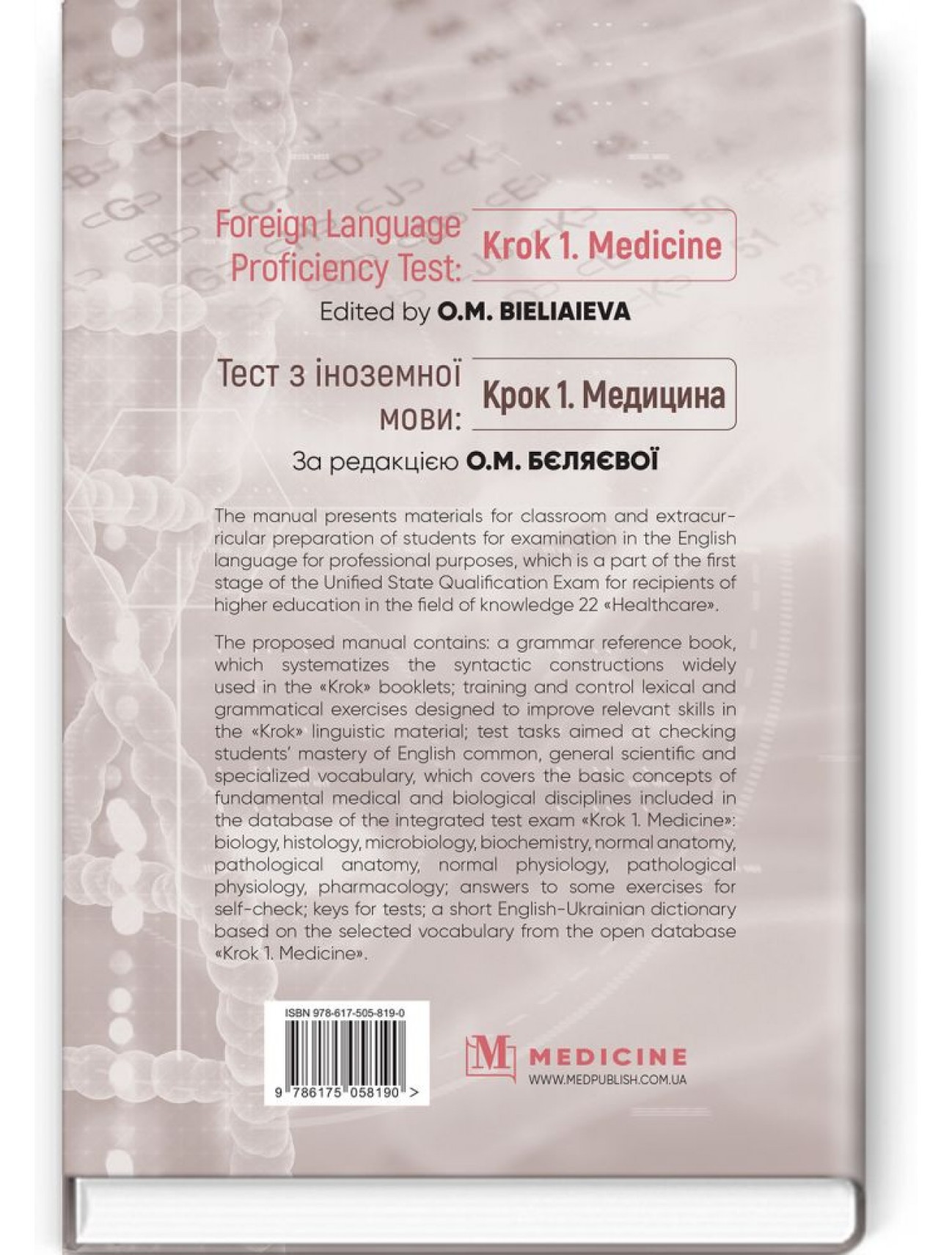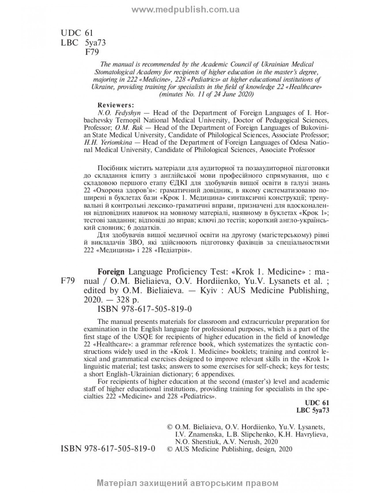 Анотація, характеристики, відгуки на книгу: Foreign Language Proficiency Test: «Krok 1. Medicine»: manual — O.M. Bieliaieva, O.V. Hordiienko, Yu.V. Lysanets et al., 2020