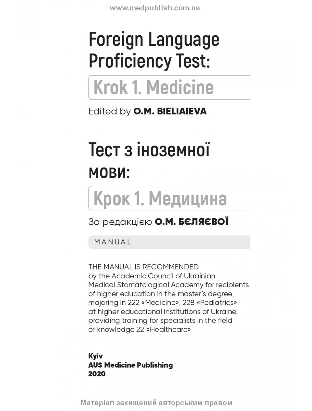 Foreign Language Proficiency Test: «Krok 1. Medicine»: manual — O.M. Bieliaieva, O.V. Hordiienko, Yu.V. Lysanets et al., 2020