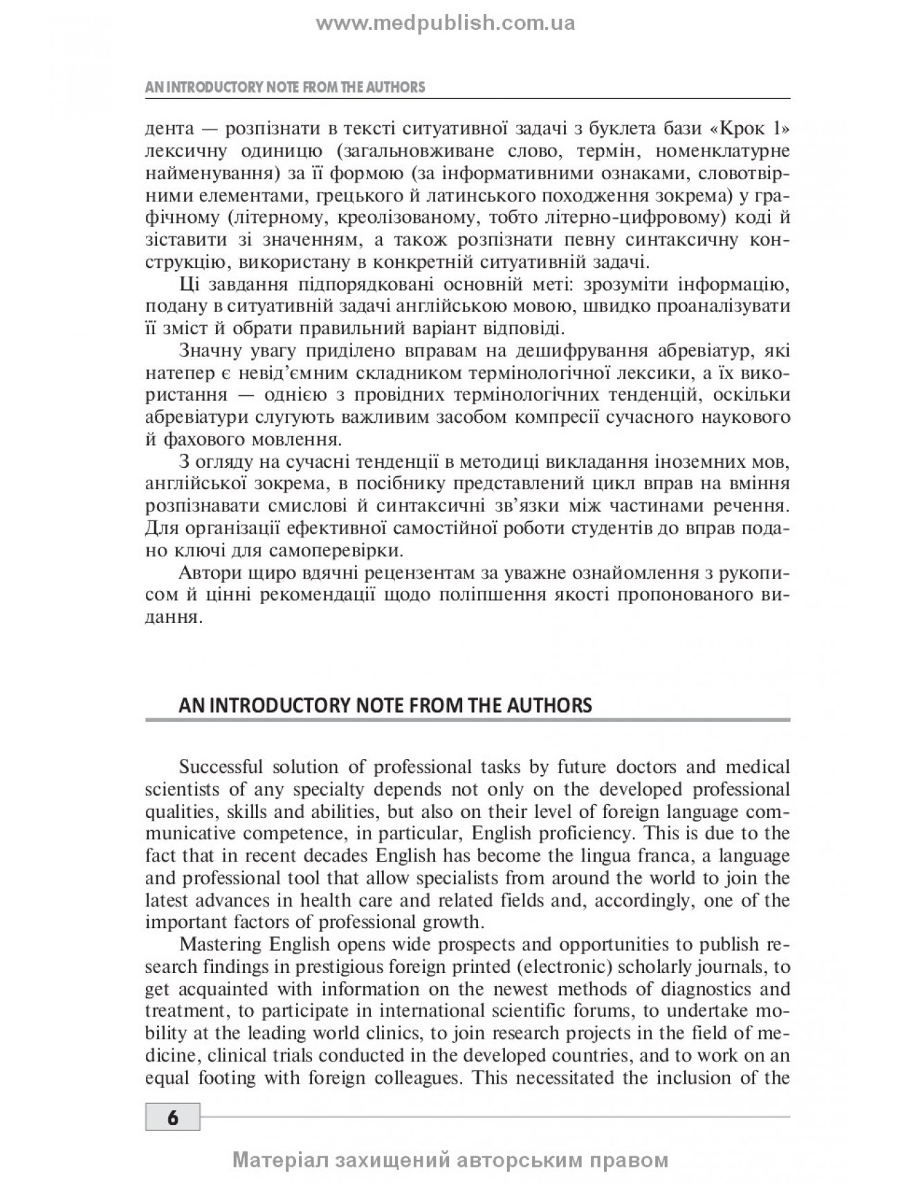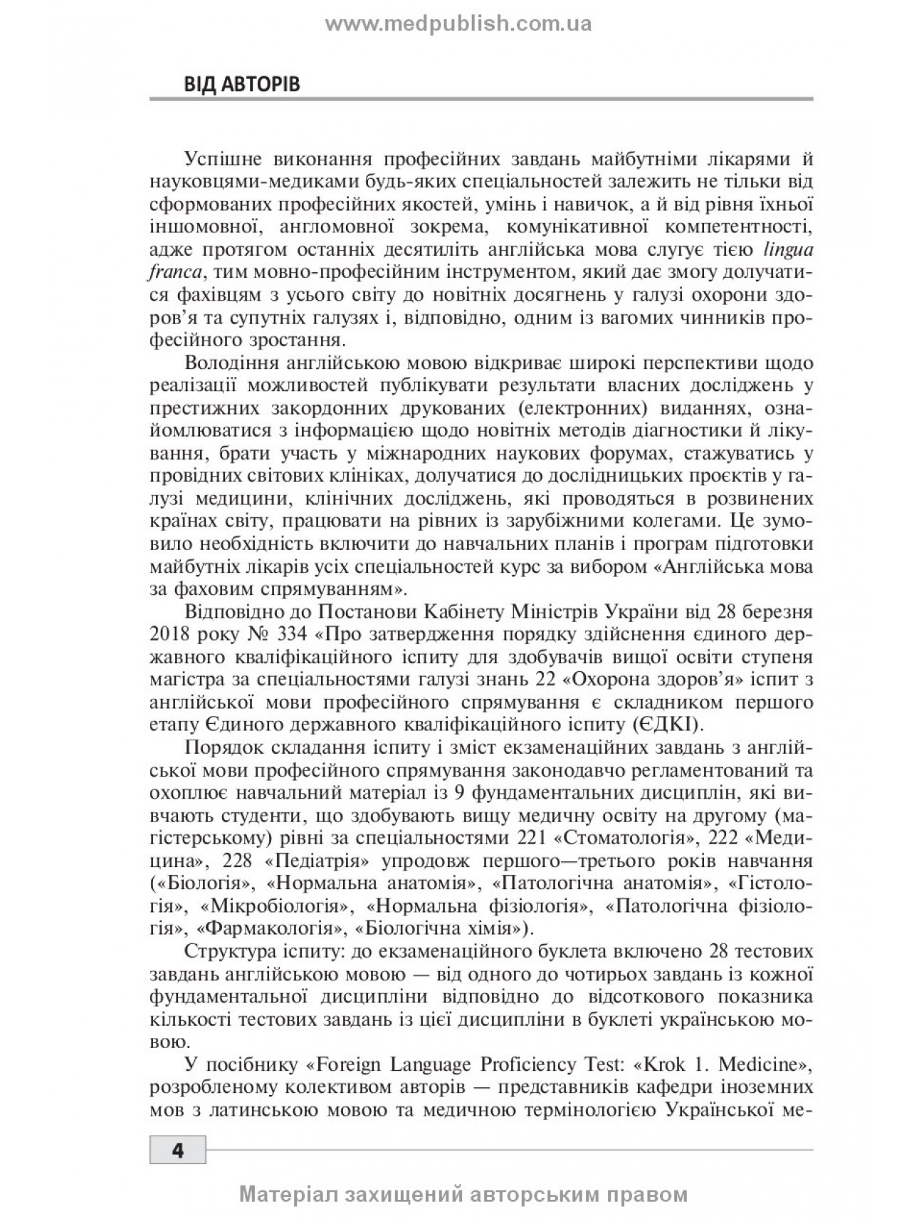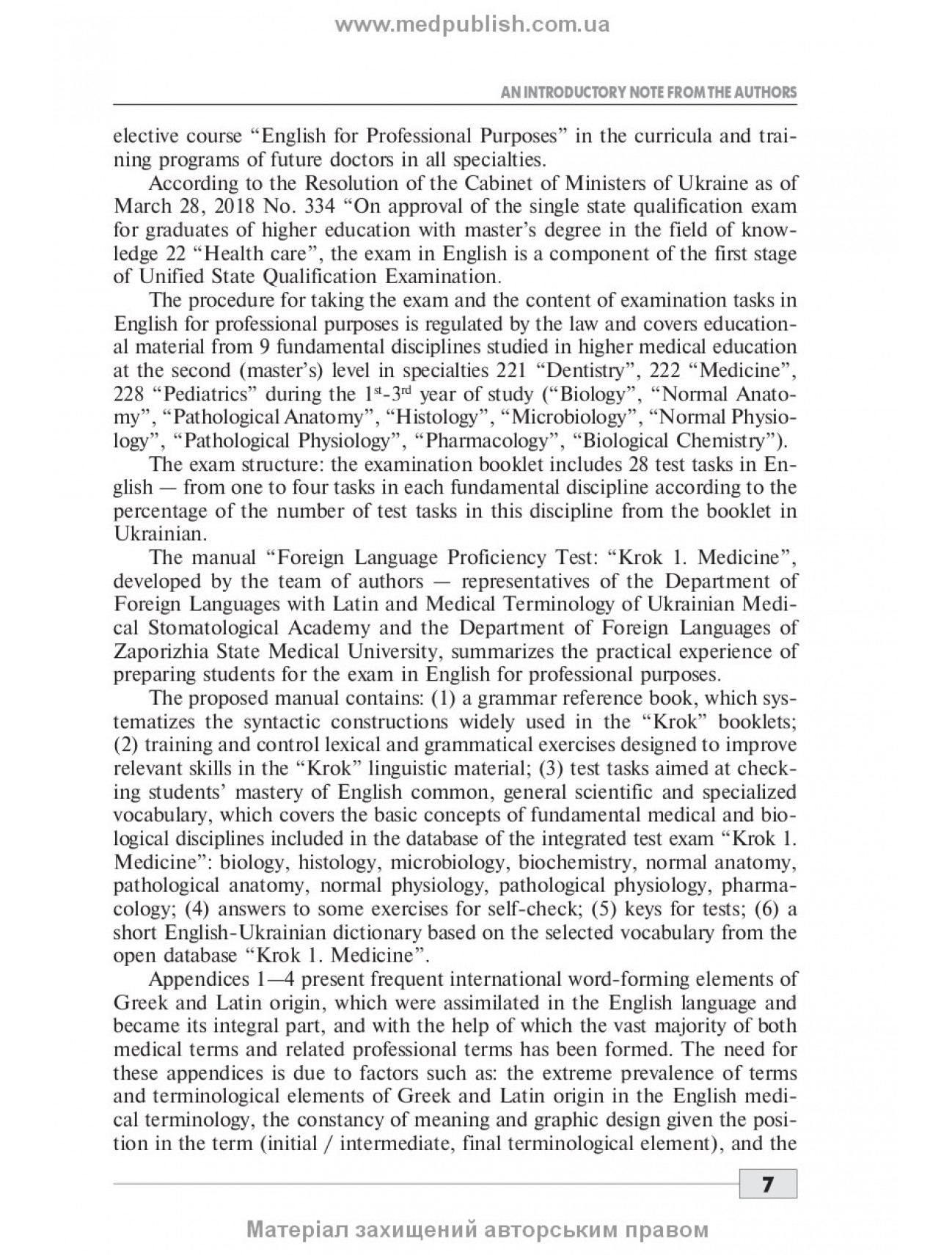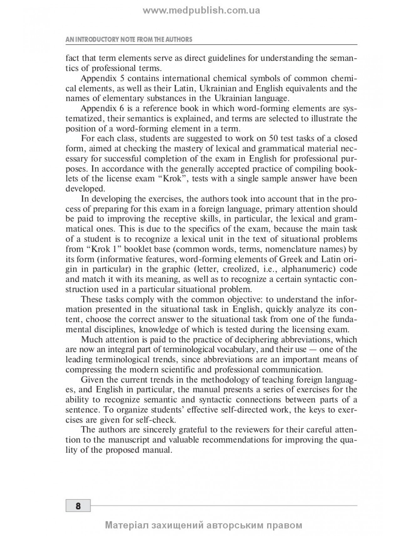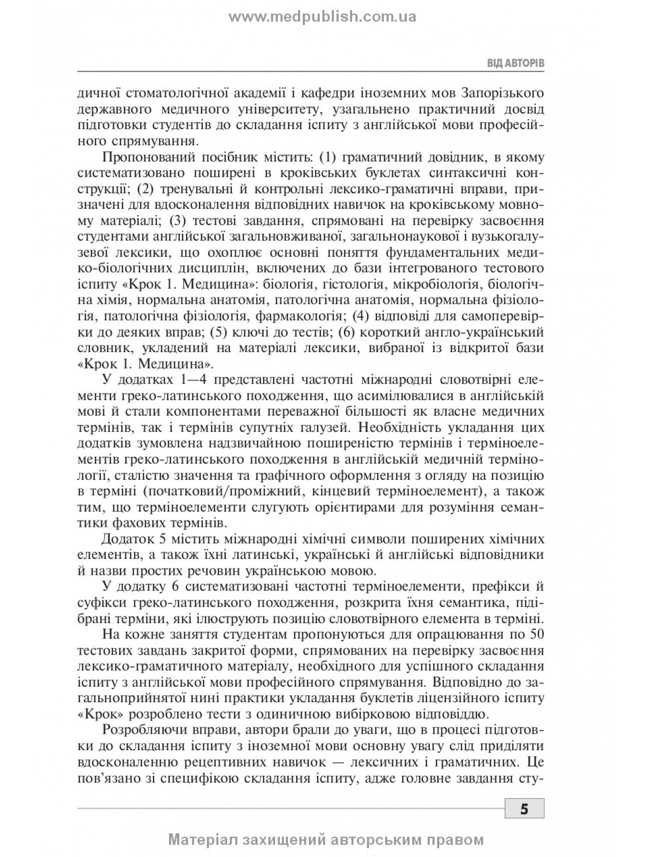 The manual presents materials for classroom and extracurricular preparation for examination in the English language for professional purposes, which is a part of the first stage of the USQE for recipients of higher education in the field of knowledge 22 «Healthcare»: a grammar reference book, which systematizes the syntactic constructions widely used in the «Krok 1. Medicine» booklets; training and control lexical and grammatical exercises designed to improve relevant skills in the «Krok 1» linguistic material; test tasks; answers to some exercises for self-check; keys for tests; a short English-Ukrainian dictionary; 6 appendixes.