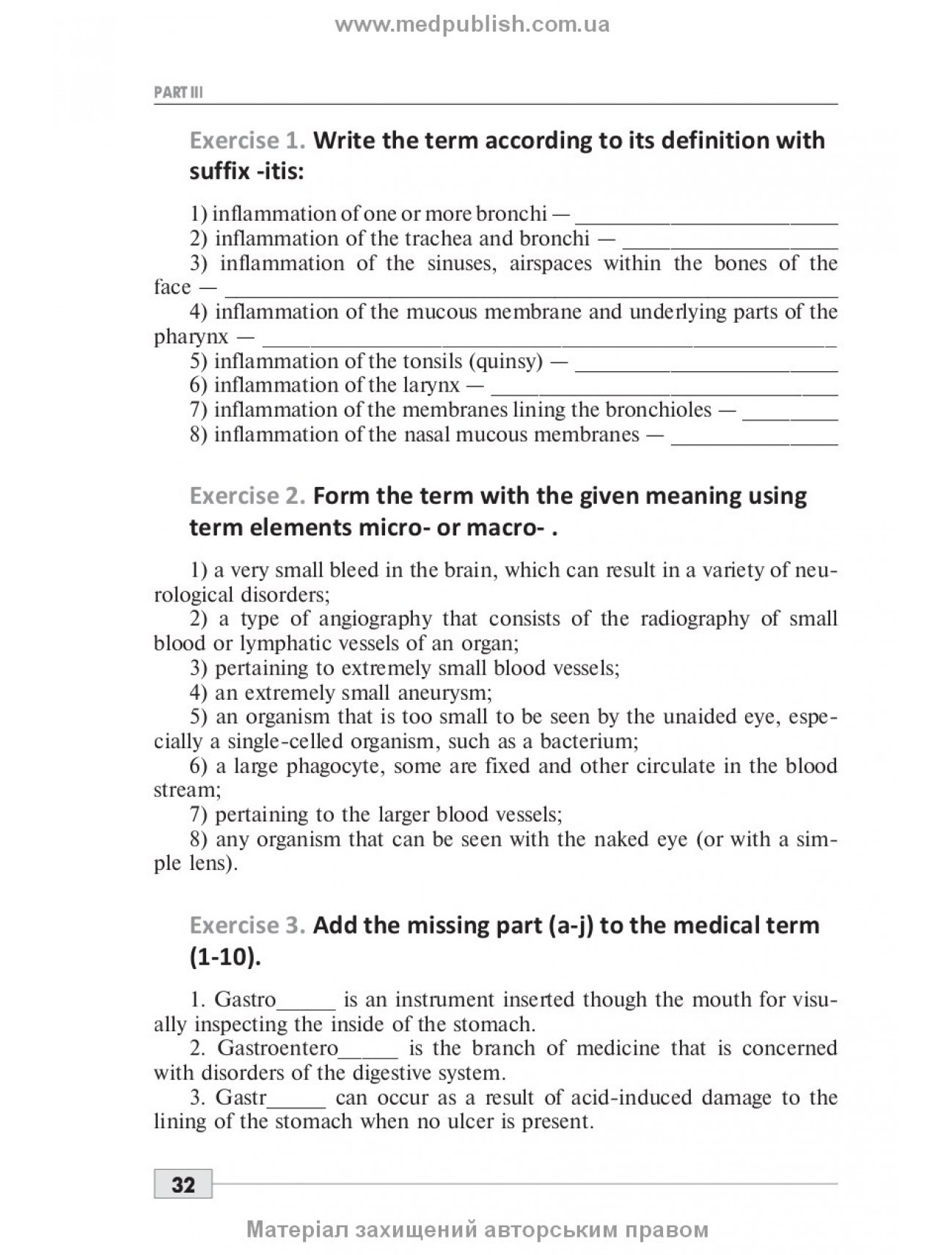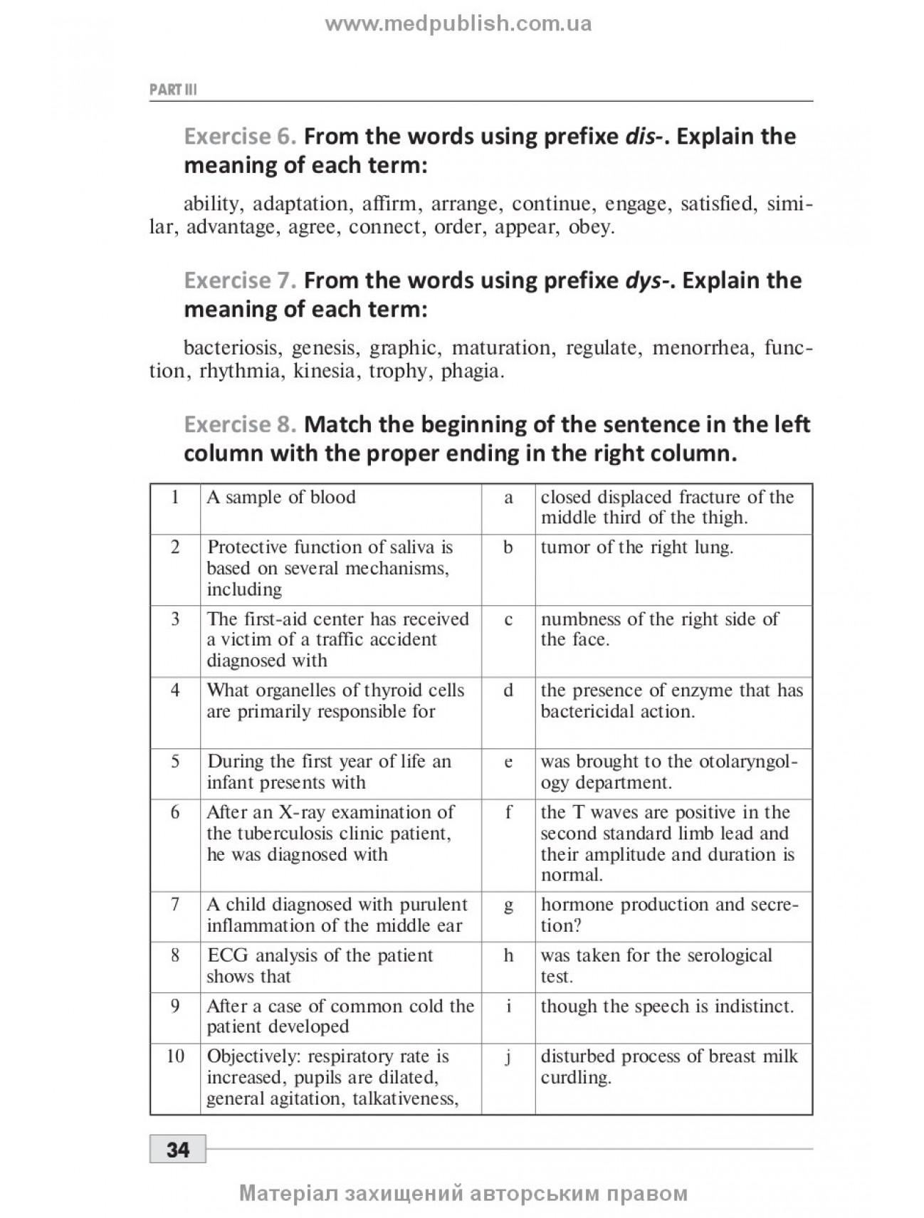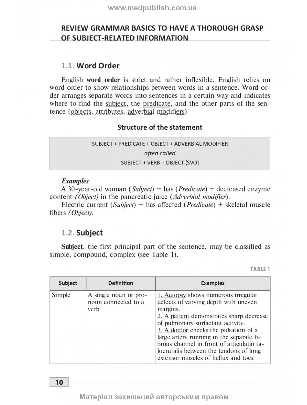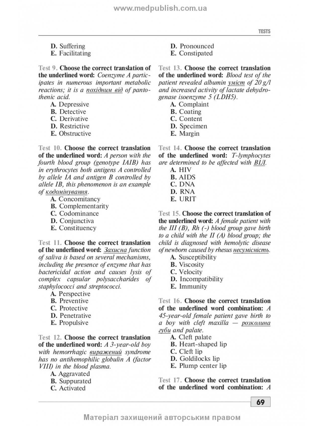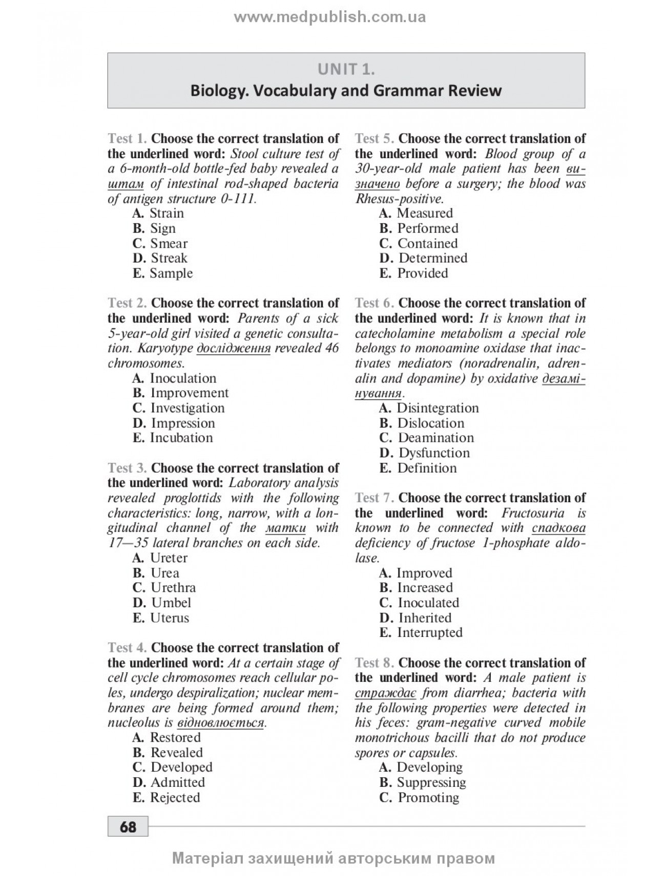 The manual presents materials for classroom and extracurricular preparation for examination in the English language for professional purposes, which is a part of the first stage of the USQE for recipients of higher education in the field of knowledge 22 «Healthcare»: a grammar reference book, which systematizes the syntactic constructions widely used in the «Krok 1. Medicine» booklets; training and control lexical and grammatical exercises designed to improve relevant skills in the «Krok 1» linguistic material; test tasks; answers to some exercises for self-check; keys for tests; a short English-Ukrainian dictionary; 6 appendixes.