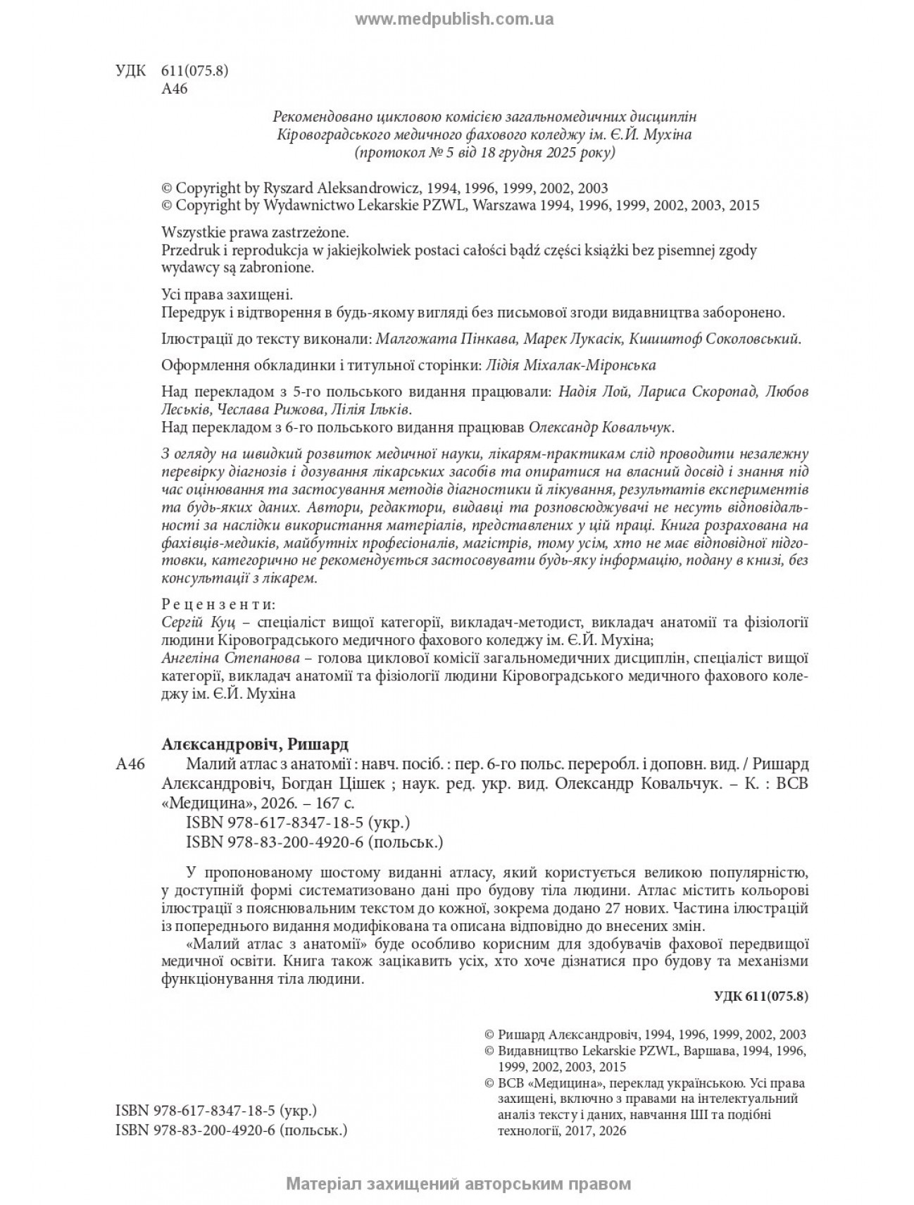 | Ліцензія | переклад Maly atlas anatomiczny, wydanie VI публікується відповідно до договору з Lekarskie PZWL |