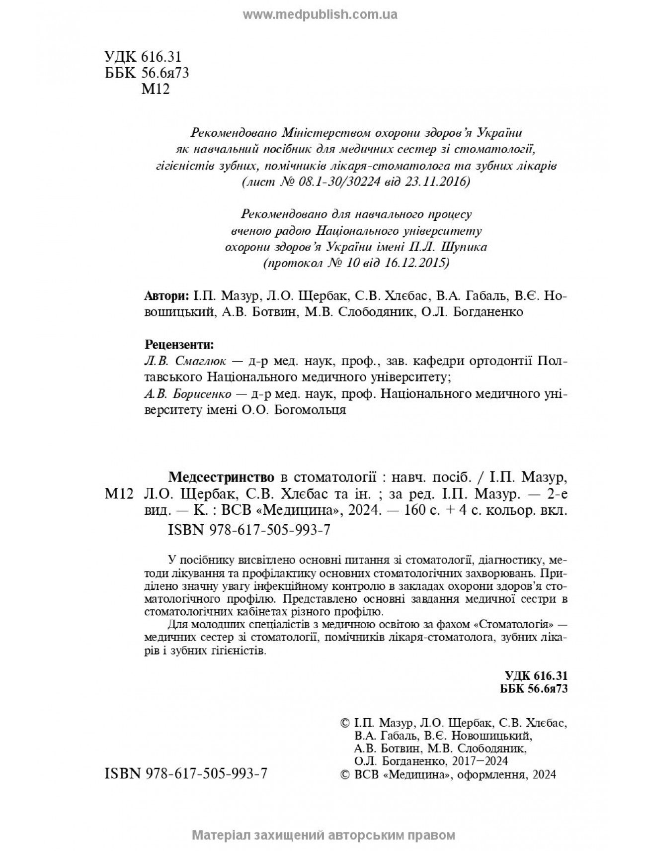 Анотація, характеристики, відгуки на книгу: Медсестринство в стоматології / І.П. Мазур, Л.О. Щербак, С.В. Хлєбас та ін. — 2-е видання