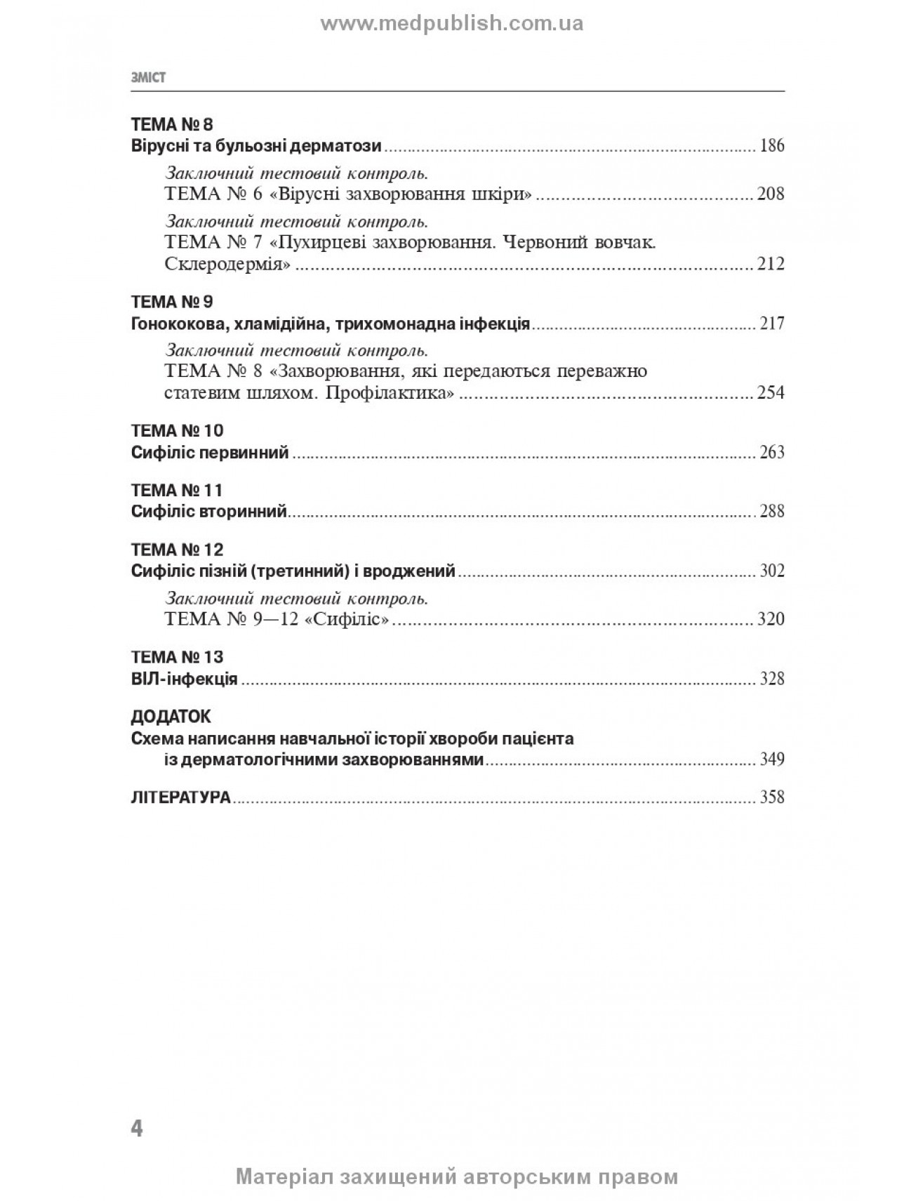 У навчальному посібнику системно, відповідно до навчальної програми і тематичних планів медичних (фармацевтичних) закладів фахової передвищої та вищої освіти, викладено практичну частину. У кожній темі розкрито актуальність, мету, описано етіологію та патогенез, клінічні прояви, діагностику, лікування і профілактику різних дерматозів і захворювань, які передаються статевим шляхом. Питання, тести, клінічні задачі та завдання, запропоновані алгоритми для відпрацювання практичних навичок допоможуть студентам і медичним працівникам вивчити, повторити та закріпити навчальний матеріал.